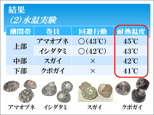 水中にとどまった個体については、クボガイが41℃、スガイが42℃で動かなくなってすぐに死んでしまったのに対し、イシダタミは43℃、アマオブネは45℃で軟体部の一部を出して動かなくなりました。しかし、そこからすぐに取り出せば生き続けました。
