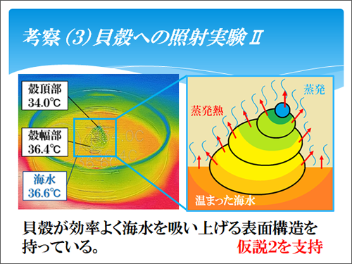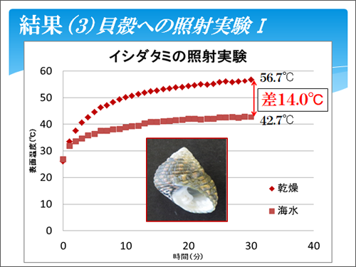 さらに、貝殻への照射実験IIからわかるのは、イシダタミの貝殻の表面を削った方が、削らずにそのままの方より温度上昇が大きかったことです。その理由は、表面構造を削ったことで、海水を保水したり、吸い上げたりできなかったからだと思われます。