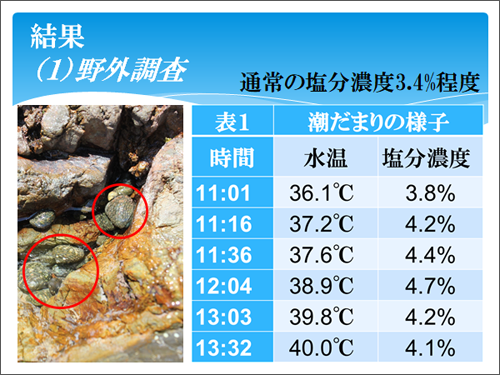 下表は、イシダタミがいた潮だまりの中で最も温度が高かったところの、水温と塩分濃度の変化です。13時32分には40℃に達し、塩分濃度の変化も見られました。こうした場所で、イシダタミは水底にいたり、水温の上昇とともに水中から這い出して水面すれすれでじっとしていました。