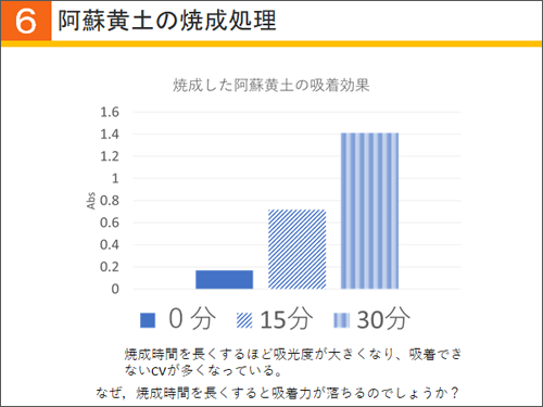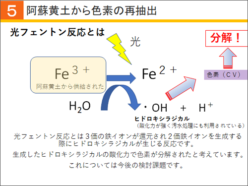 この阿蘇黄土から生じたヒドロキシルラジカルの酸化力によって、有機化合物である色素が分解されたのではないかと考えています。これについては今後の検討課題として、さらに実験を行っていきたいと思います。