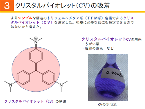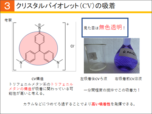 そこで、よりシンプルな構造のトリフェニルメタン系色素であるクリスタルバイオレットで実験を行えば、吸着に必要な部位を特定できるのではないかと考えました。クリスタルバイオレットの構造がこちらです。