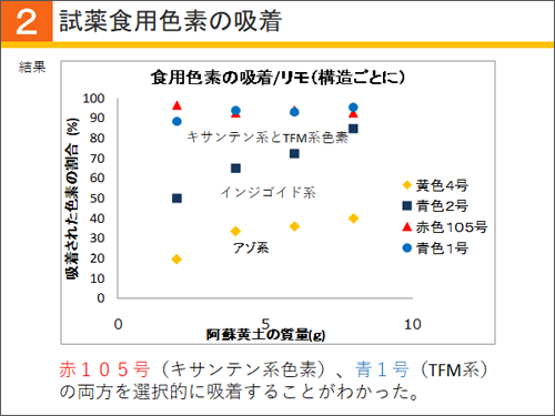 阿蘇黄土のすごさを感じてほしいです。トリフェニルメタン系色素を選択的に脱色するところが特に面白いところです。