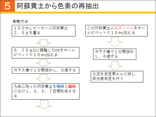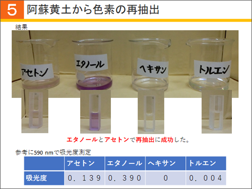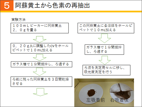 次に行ったのは、阿蘇黄土から色素の再抽出です。色素を再抽出できれば阿蘇黄土を使い捨てる必要がなくなり、再利用できる環境にやさしい水質浄化剤の開発へと発展できると考えました。