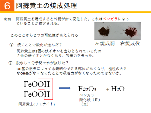 二つ目の可能性は、脱水して分子間の水が抜けたという可能性です。阿蘇黄土はFeOOHで、FeOOHのOHの部分がなくなり、水素結合できる部分がなくなって、吸着力が失われたのではないかと考えられます。