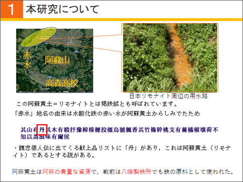 熊本県の赤水や狩尾一帯では、水酸化酸化鉄が表層から深いところで3 mにわたって存在し、「阿蘇黄土(リモナイト)」と呼ばれています。この土は鉄分を多く含み、田んぼや用水路にしみだした土が赤くみえることから「赤水」の由来となったとも言われています。弥生時代には阿蘇黄土が土器の装飾などに使われており、このような土器が多数出土しています。この豊富に存在する阿蘇黄土を利活用することが期待されており、すでに硫化水素などの気体の吸着材として普及しています。そこで私たちは、身近な阿蘇黄土を水の浄化剤として活用できないかと考えました。