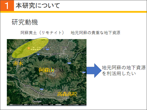 研究に用いた阿蘇黄土は、阿蘇山の北側に広く分布しています。阿蘇黄土は表層から、深い所で地下3メートルまで豊富に存在します。この地元の地下資源を、ぜひ活用したいと考えました。