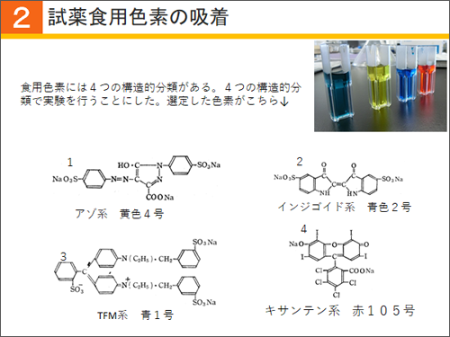 文献調査から、色素には四つの構造的分類があることがわかりました。そこで、四つの構造を持つ食用色素をそれぞれ選定しました。
