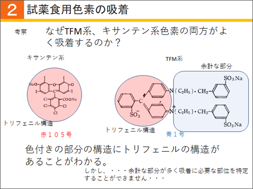 ではなぜ、トリフェニルメタン系、キサンテン系色素が吸着するのでしょうか。
