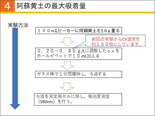 ここまでの実験で、阿蘇黄土が色素を非常によく吸着することがわかりました。では、どこまで吸着するのでしょうか。色素の濃度を大きくして、最大吸着量を求めました。