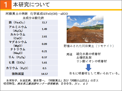 4)「「阿蘇黄土」及び「阿蘇火山灰土」のガス吸収特性」永末知子,永田正典、蔵本厚一(熊本県工業技術センター研究報告,2005,No.43 ,pp.1-4.)