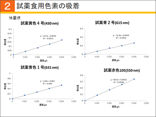 作成された検量線が下図です。相関係数はどの値も0.99を超えています。