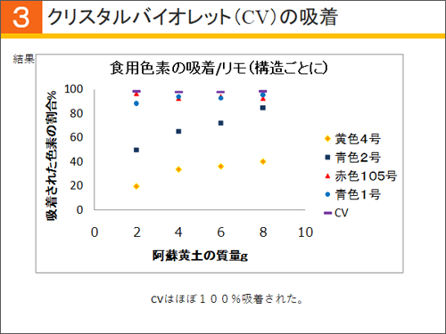 2グラムの阿蘇黄土でもクリスタルバイオレットは、ほぼ100パーセント吸着しており、これまでのどの色素より吸着していることがわかりました。