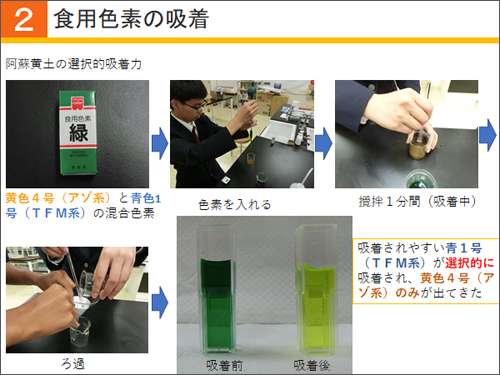 阿蘇黄土が選択的吸着特性を持つため、次のような実験が可能です。黄色4号と青色1号の混合色素である緑の色素を入れて撹拌し、ろ過します。すると、吸着されやすい青1号が選択的に吸着され、黄色4号のみが出てきます。