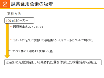 100mLビーカーに阿蘇黄土を各2、4、6、8g入れ、そこに2.0×10-3g/Lに調整した各色素10mLをホールピペットで加えます。そしてガラス棒で1分間よく撹拌し、ろ過します。ろ液を吸光度測定し、吸着された量を、作成した検量線から算出します。