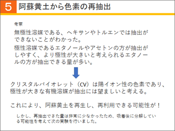 クリスタルバイオレットは陽イオン性の色素であり、極性が大きな有機溶媒が抽出に望ましいと考えられます。このようなことから、阿蘇黄土を再生し、再利用できる可能性が広がりました。