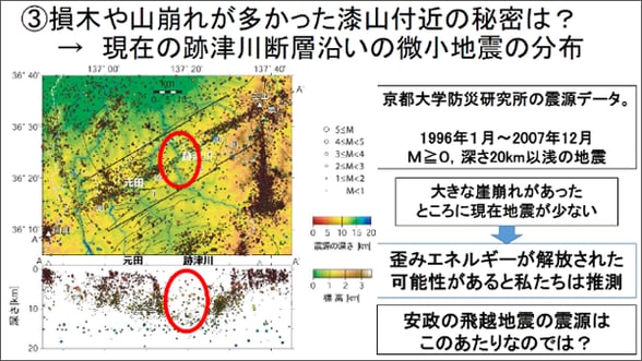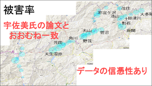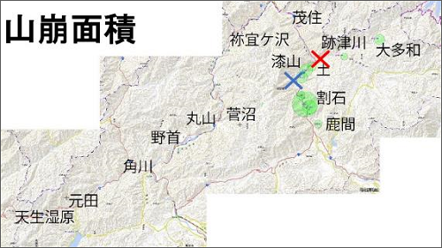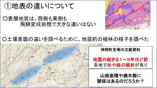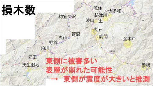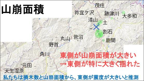 しかし、植林した土地と山崩れの土地を照合した結果、東側も西側も同じように植林されていました。しかし、東側に山崩れが多く、西側には山崩れが少ないことから、震度が大きかったのは、山崩れが多い東側だったと推測されます。