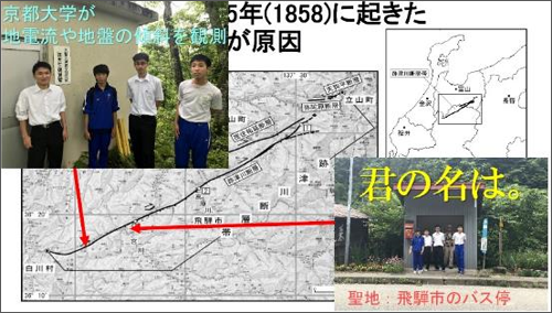 飛越地震は、江戸時代末期の安政5年(1858年)に起きた地震で、岐阜県北部に位置する跡津川断層の活動が原因であると言われています。跡津川断層上には、京都大学の観測施設(飛騨天文台)や、映画『君の名は。』の聖地となったバス停もあります。