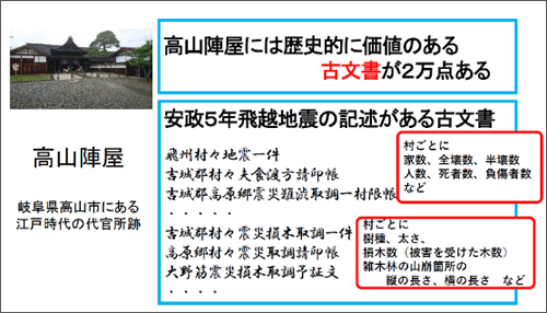 今回古文書を提供してくださった高山陣屋には、歴史的な価値のある古文書が約2万点もあります。今回使用した飛越地震についての記述がある古文書は下図に挙げたようなもので、そこからは村ごとの家の数と倒壊数、全壊数・半壊数、村ごとの人口と死者・負傷者数、さらに被害を受けた樹木の種類やその太さ、数、および雑木山の山崩れ箇所の縦横の長さなどのデータが得られました。