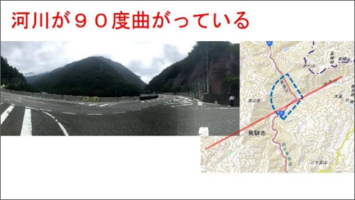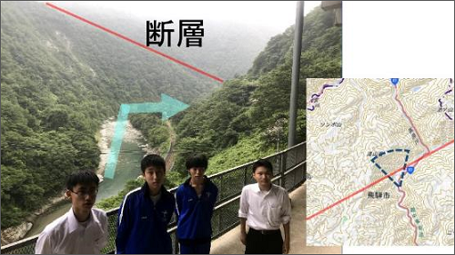 また、跡津川のポイントにも行ってきました。土(ど)(地名)は断層の近くで、断層によってずれて河川が「く」の字に90°曲がっています。そのずれは約3kmにもおよびます。