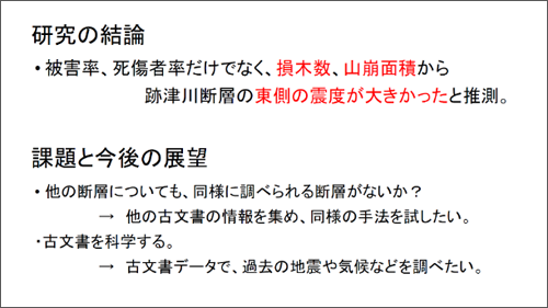 今後の展望では、他の断層についても同様に調べられる断層はないか、他の古文書の情報を集め、同様の手法を試したいと考えています。