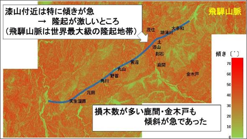 その結果がこちらです。赤い部分は傾きが急で、緑の部分はなだらかであることを示しています。この結果から、断層沿いの斜面は急であることがわかりましたが、漆山付近は、特に傾きが急で隆起が激しいことが推測されました。また、損木数が多い鹿間、金木戸も傾斜が急であったことがわかります。