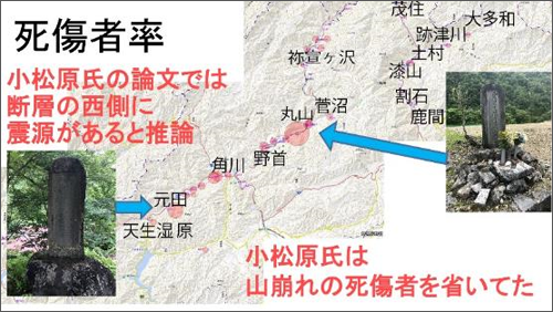 下図は、死傷者率を円の面積で表して地図上に載せたものです。これは、小松原氏の論文と一致しなかった点がありました。小松原氏は、山崩れによる死傷者を省いていましたが、私たちはそれを入れていたため、このような違いがあったと考えられます。小松原氏は、断層の西側に震源があると予想していました。