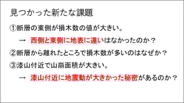 これらから見つかった新たな課題が下図です。まず、断層の東側の損木数や山崩れの値が大きいことから東側が大きく揺れたと推測するには、西側と東側に地層の違いがなかったことを示さなければならなりません。