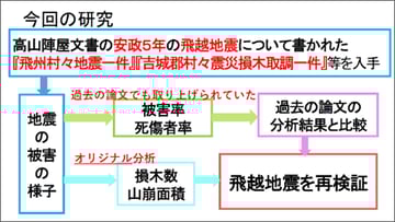 私たちは、江戸時代に起きた飛越地震を再検証するというテーマで研究をしてきました。今回の研究では、高山市にある高山陣屋から、飛越地震に関する文書『飛州村々地震一件』や、『吉城郡村々震災損木取調一件』などの古文書のデータを提供していただき、そこから被害率や死傷者率、損木数、山崩れ面積などを求めて、飛越地震の揺れがどのようなものであったか、震央はどこであったのかなどについて再検証しました。