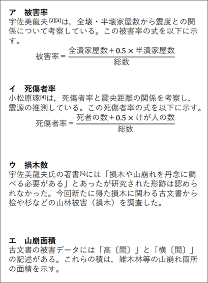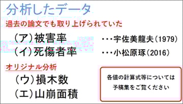 今回分析したデータは、被害率、死傷者率、損木数、山崩れ面積の四つです。被害率は倒壊した家屋の割合のことで、過去に宇佐美龍夫氏が論文で取り上げていました。死傷者率は、過去に小松原琢氏が論文で取り上げていました。この二つのデータに関しては、私たちが分析した結果と彼らの分析した結果も比較を行いました。