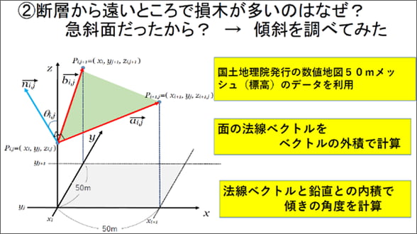次に、断層から遠い所で損木数が多かった理由は、そこが急斜面であったからではないかと考え、傾斜を調べました。使用したのは、国土地理院の数値地図50mメッシュ(標高)データです。このデータに入れた法線ベクトルを使って、傾きの角度を計算しました。