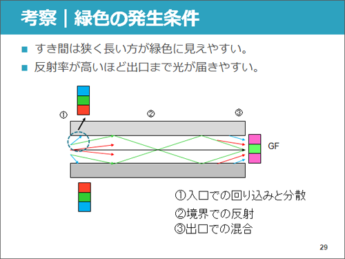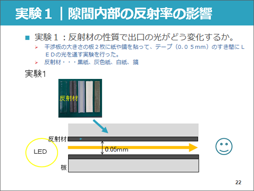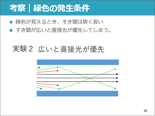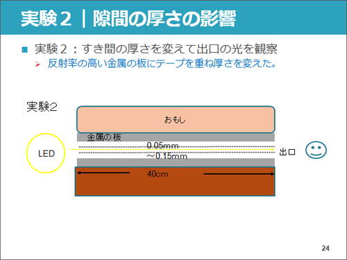 次に私たちは板の表面に光を反射する金属板を貼り、隙間の厚さを0.05mmから0.15mmまで変化させて同様の実験を行いました。その結果、隙間を狭くすればするほど、緑色の光がはっきり美しく見えるようになりました。これは、板の隙間が大きいと、白色LEDの光の大部分が金属板で反射せずに板の隙間をまっすぐ通ってゆくからだと考えられます。