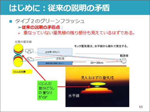 グリーンフラッシュが起きるのは、今挙げた「下位蜃気楼」「モック蜃気楼」が起きるときです。そのうち「下位蜃気楼」が起きるときのグリーンフラッシュについては、私たちの先輩がすでに研究されました。今回私たちが調べたのは「モック蜃気楼」と同時に起きるグリーンフラッシュです。