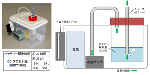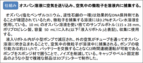 採取のために下図のような装置を作りました。装置にはDNAを保持するオスバン水溶液が入っており、そこに空気を送り込むことで空中の微粒子を捉えます。