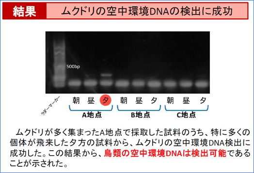 最初の実験対象は身近にいるムクドリとしました。街路樹に採取装置を朝昼夕の3度に分けて設置し、DNAの検出を調べました。その結果、ムクドリが最も集まっていた夕方にDNAを検出することができました。これにより、空中環境DNAの存在し、私たちの装置によって回収できることが示されました。