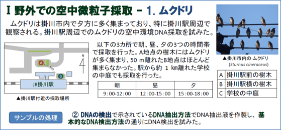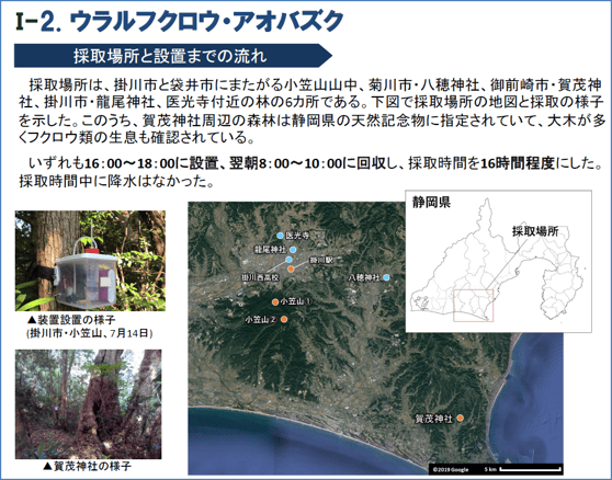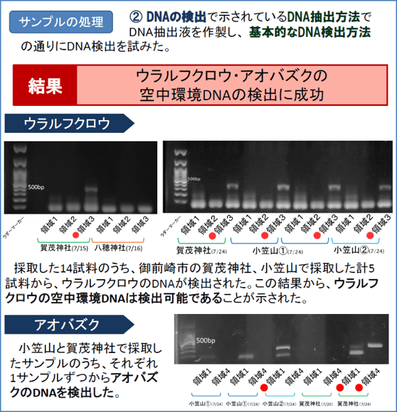 そして、学校付近の6箇所の地点で採取を行い、空中環境DNAの検出を試みました。その結果、ウラルフクロウとアオバズクともに2箇所においてDNAが検出されました。このことから、夜行性の鳥類についても空中環境DNAを用いて生息を確認することができると考えられます。