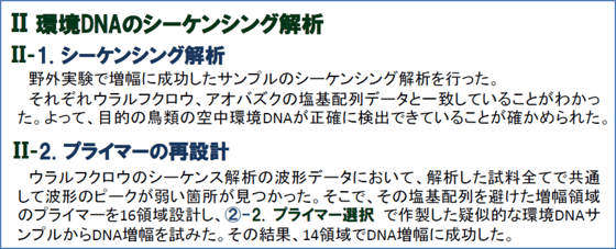 そこで、その部分を避けた増幅領域のプライマーを16領域設計し、増幅を試みました。その結果、14領域でDNA増幅に成功しました。このことから、DNAの解析によって有効なプライマーを意図的に設計することができる可能性があります。また、検出感度の強いものと弱いものを組み合わせることで、研究対象の生物の生息について定量的な実験も行うことが可能であると考えられます。今後はこの方向でさらに研究を進めていきたいと思います。