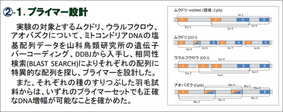 はじめに、擬似的な環境DNAサンプルからDNAを検出し、プライマーセットを用いてDNA増幅が可能かどうかを調べました。サンプルは羽毛を液入りボトルに入れ、軽く振って羽毛の表面物質を液中に落とすことで作成しました。