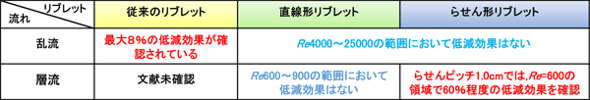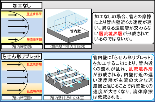 らせん形リブレットでは、管壁近くの流れが乱れ、中心付近の速度層と混じることで管壁近くの速度が比較的大きくなり、流体摩擦が低減されたものと考えられます。