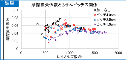 この結果から、Re=500〜1000において、らせんピッチが最も小さい1.0cmのときは摩擦損失係数が他に比べて大幅に小さいことがわかりました。