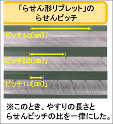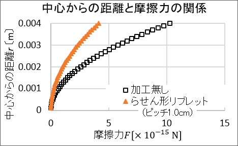 これに、加工なしとリブレット模型の結果をそれぞれ当てはめたのが、左のグラフです。らせん形リブレットの方が摩擦力が小さいことがわかります。