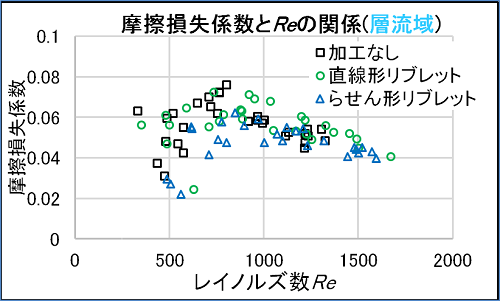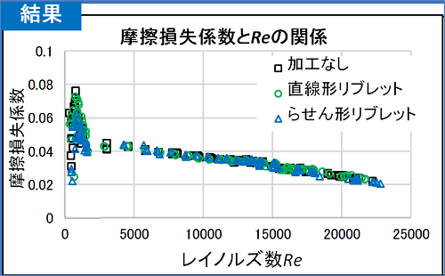 この結果から、レイノルズ数Re=2500〜22500においては摩擦損失係数の差は見られず、Re=500〜1000においては「加工なし」に比べて「らせん形リブレット」の方が摩擦損失係数が小さいことがわかりました。