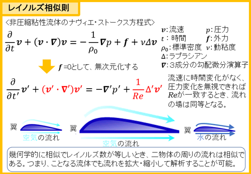 まず、その前提としてレイノルズ相似則を説明します。非圧縮粘性流体にはナヴィエ・ストークス方程式が与えられます。外力f=0として無次元化し、流速の時間変化がないという前提で、遅い流れゆえの圧力変化を無視すれば、レイノルズ数が等しい時に流れの場は同等となります。