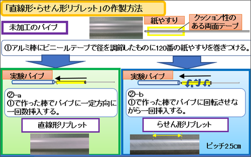 まず、リブレットの作製方法を説明します。未加工の塩化ビニール製パイプと、ビニールテープで径を調節したアルミ棒に紙やすりを巻きつけたものを用意します。アルミ棒をパイプにまっすぐ挿入すると、直線形リブレットができます。また、回転させながら挿入することで、溝に傾きをつけ、これをらせん形リブレットとします。