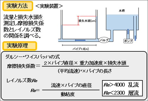 実験では、摩擦損失係数とレイノルズ数の関係を調べるために、左図のような装置を作り、摩擦損失係数とレイノルズ数(Re:※)の関係を調べました。
