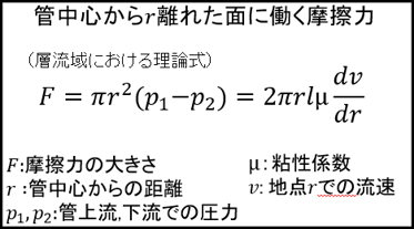 この考察から、管に働く流体摩擦についてより詳しく調べました。管中心から距離r離れた面に働く摩擦力は、左の式で求められます。