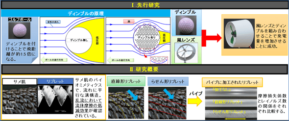 ゴルフボールは、ディンブルという表面の凹凸をつけることで飛距離が伸びることがわかっています。また、競泳用の水着は、水中ではサメ肌の模倣であるリブレットという構造が、乱流における流体摩擦を低減させることがわかっています。サメ肌の構造から、私たちは新たに直線形リブレットとらせん形リブレットを考案しました。