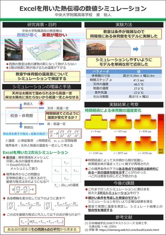 そこで私は、この身近な現象のシミュレーションによる検証を試みた。具体的には、日当たりがよく暖まりやすい屋上を高温熱源、建物の下で日の当たらない地面を低温熱源とみなし,建物内の温度の時間変化を熱伝導方程式の定常問題として扱い,解析対象をメッシュに分割する差分法を用いて解くことで解析した。実験では,単純な環境として体育館をモデルにシミュレーションを行った。結果は,建物の屋上側から地階に向かって時間とともに温度勾配が生じる様子が可視化され,建物内のある地点では最終的に一定の温度に収束する様子が示された。このような身近な現象のシミュレーションは,普段の授業において生徒の興味関心を高めるのに役立つと期待している。