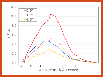 今回は、従来の実験条件に加えて三つの電圧を使って鉄芯とコイルの中心からの位置と加わる力の関係を調べました。結果をグラフにまとめたのがこちらのグラフです。
