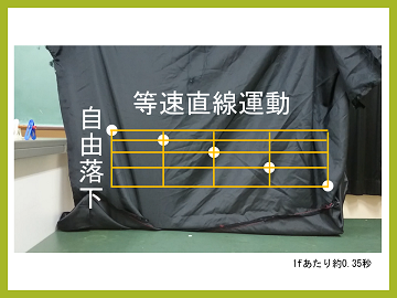 ここで鉄芯は垂直方向には自由落下、水平方向には等速直線運動をしていることがわかります。運動エネルギーは1/2mv²(mは質量、vは速度)で与えられます。私たちの実験では、鉄芯の質量mを一定にしたので、運動エネルギーは鉄芯の初速度vのみに依ります。発射する台の高さも固定したので、床に落ちるまでの自由落下時間、すなわち飛行時間は一定となります。