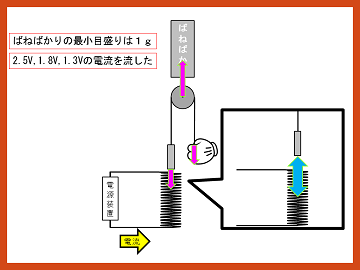 まずコイルに電流を流すと、鉄芯とコイルの間に引力が働きます。ここで鉄芯が動こうとする力を手で押さえて静止させます。すると、ばねばかりには釣り合う二つの力、すなわちコイルガンの引力と手が引っ張る力が加わります。したがってコイルガンの引力の二倍の力が測定できます。このことから、ばねばかりの最小目盛りである1gの半分である0.5g単位での測定が可能となりました。